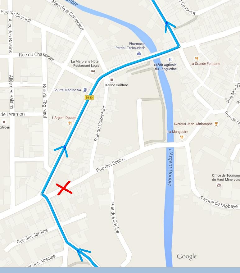 82.6 Turn right onto Avenue de l'Argent Double/D620  tricky junction take a look at this map to understand Local map